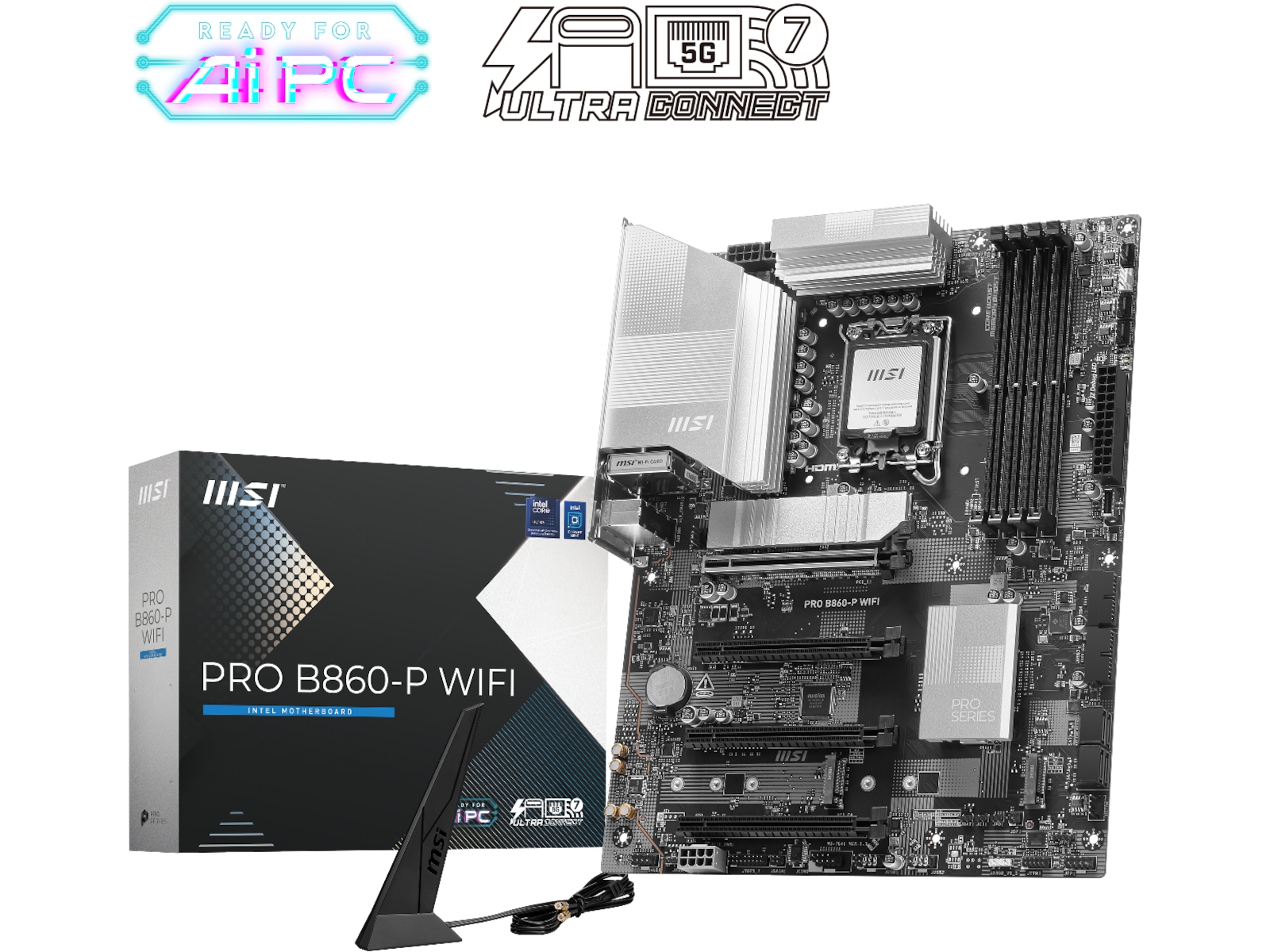 PRO B860-P WIFI erbjuder en enkel design med ett harmoniskt färgschema i silver som perfekt matchar både vita och svarta PC-byggen. Den är konstruerad med många exklusiva funktioner från MSI, en äkta Wi-Fi 7 med EZ Antenna, 5G LAN, Thunderbolt 4, PCIe 5.0 M.2 och Supplemental PCIe Power, redo för Intel® Core™ Ultra-processorer.