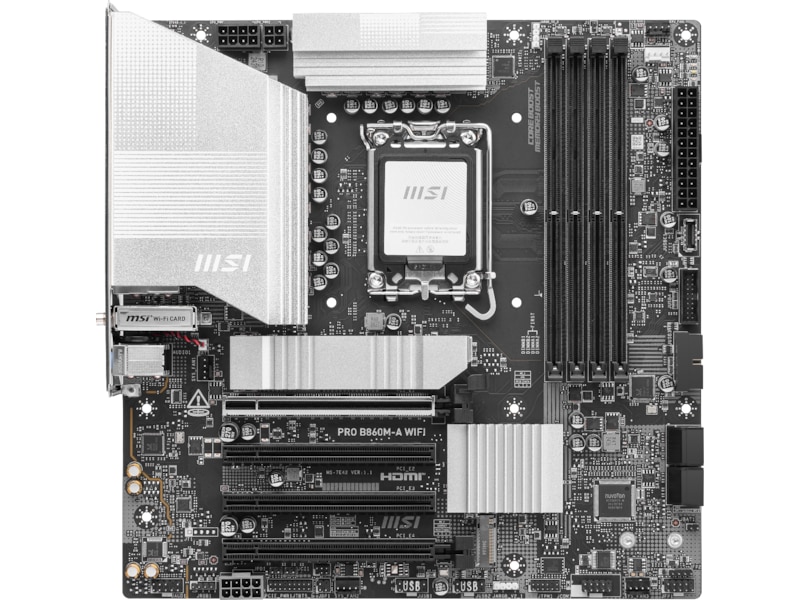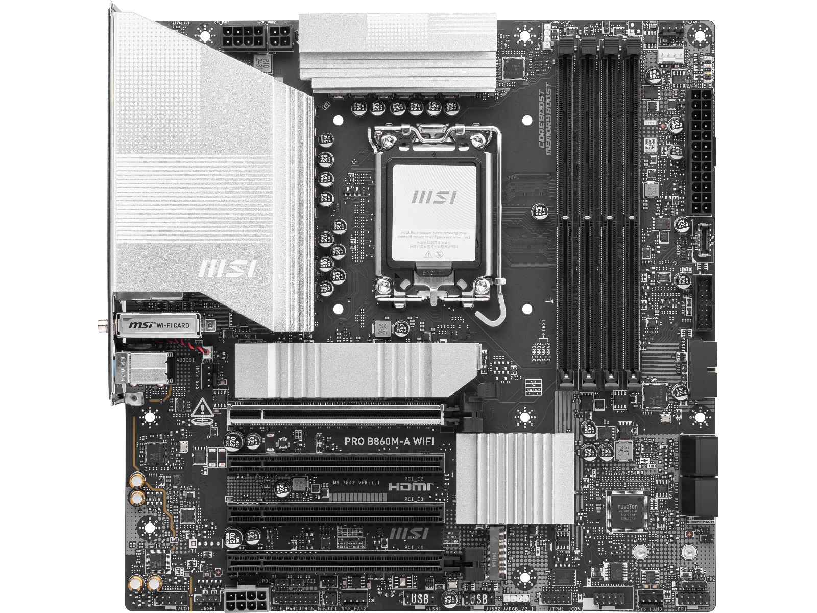 PRO B860M-A WIFI erbjuder en enkel design med ett harmoniskt färgschema i silver som perfekt matchar både vita och svarta PC-byggen. Den är konstruerad med många exklusiva funktioner från MSI, en riktig Wi-Fi 7 med EZ Antenna, 5G LAN, Thunderbolt 4, PCIe 5.0 M.2 och extra PCIe-ström, redo för Intel® Core™ Ultra-processorer.