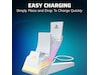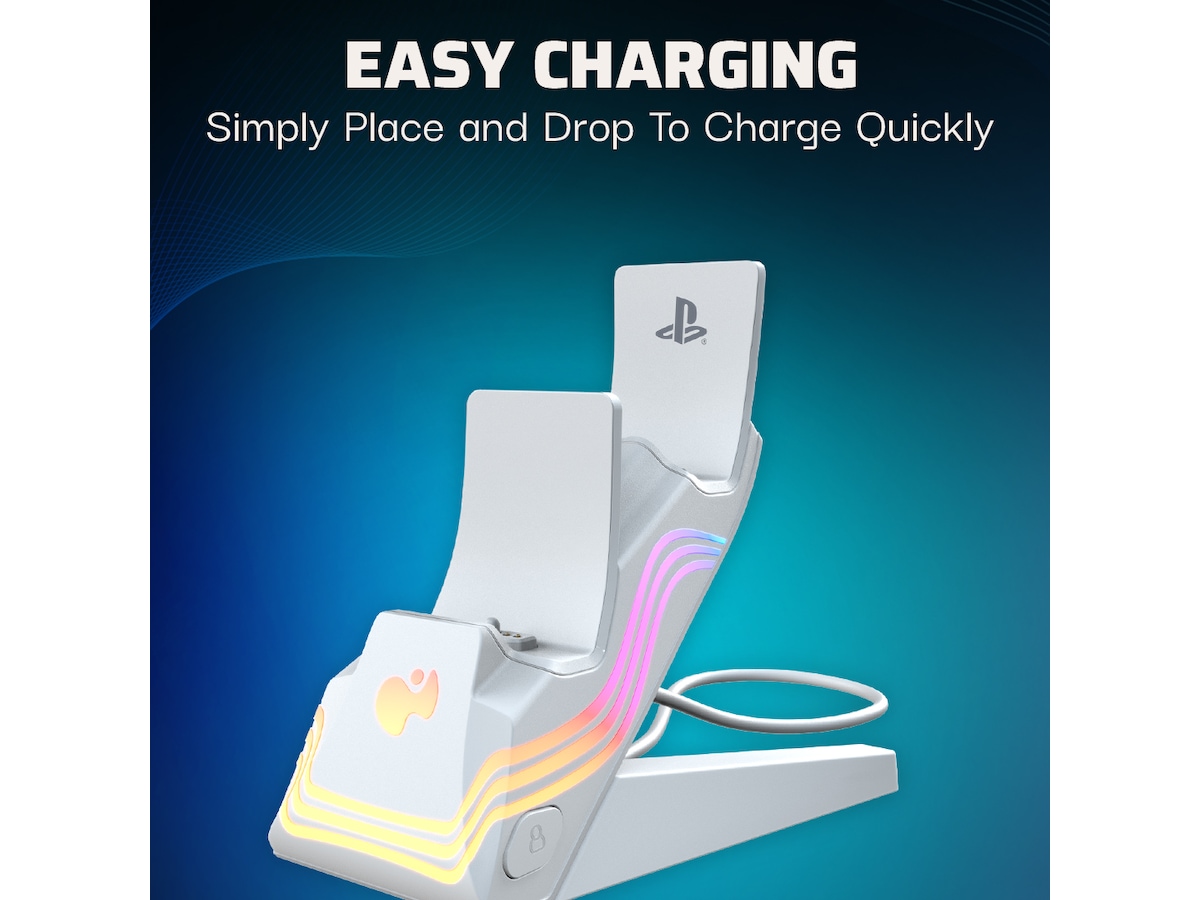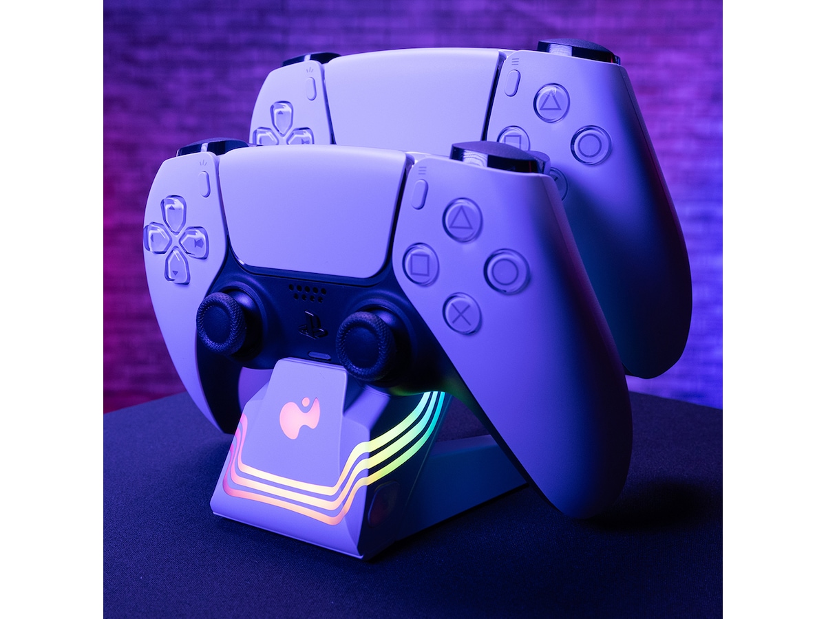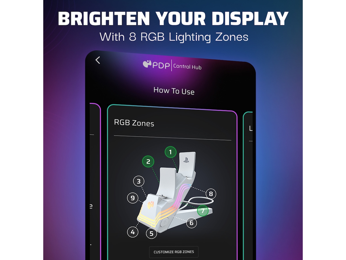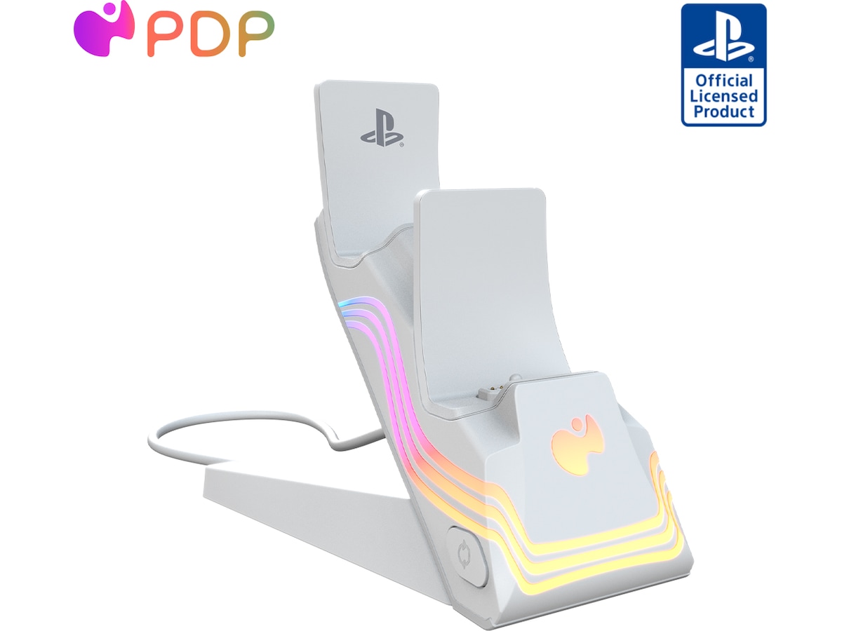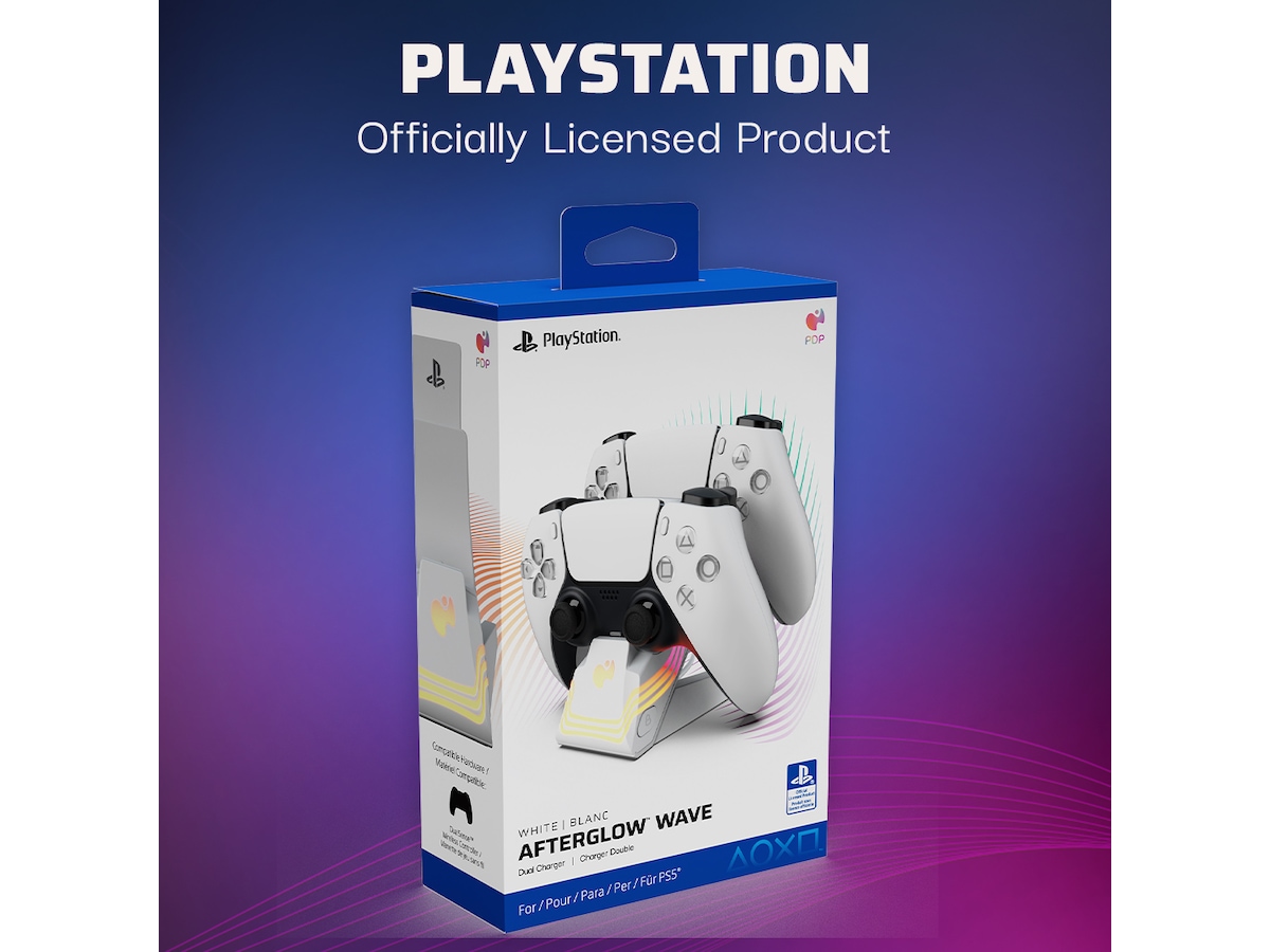 Gör vågor med de livfulla färgerna och effekterna från Black Afterglow™ Wave Dual Charger för PlayStation. Detta unika laddningssystem har åtta RGB-zoner med anpassningsbara alternativ, så du kan skapa en fantastisk displayställning för dina DualSense™ trådlösa kontroller, samtidigt som du laddar dem. Med Profiles-knappen kan du programmera upp till fem ljuseffektprofiler för att matcha ditt humör. Ladda ner den kostnadsfria PDP Control Hub-mobilappen för att övervaka laddningsstatus, skapa anpassade displayställningar och profiler, justera ljusstyrka och mycket mer. LED-laddningsindikatorer på framsidan av laddaren låter dig också snabbt kontrollera laddningsstatusen för din kontroll. Upplev en ny våg av laddning med den PlayStation-officiellt licensierade Afterglow Wave Dual Charger.