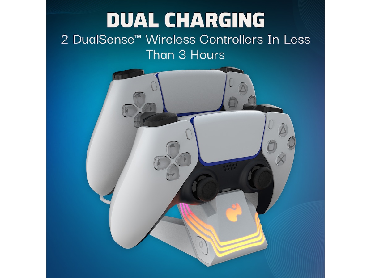 - Ladda 2 DualSense™ trådlösa kontroller samtidigt på mindre än 3 timmar för upp till 40 timmars speltid på en enda laddning
