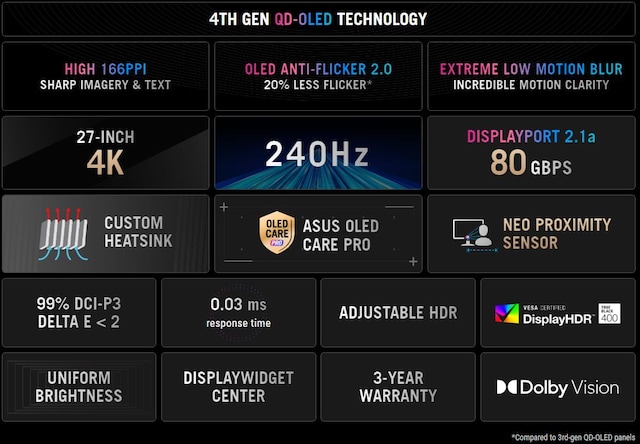 - Nya ASUS OLED Care Pro-funktioner med Neo Närhetssensor som exakt känner av när användaren är borta, växlar till en svart skärm för att minska risken för inbränning
