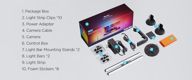 Kamerakabel, 2 ställ för ljusskenor, Strömadapter, 8 skumklistermärken, Ljusremsa, Kontroll, 10 ljusslingor clips, Kamera