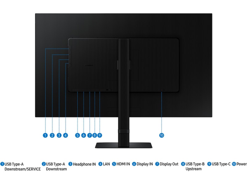 Hörlurar (minijack), USB-C (ström upp till 90W), USB-upstream (Typ B), LAN (RJ-45), DisplayPort 1.4-utgång (HDCP 2.2), 3 x USB 3.0-downstream (Typ A), HDMI (HDCP 2.2), DisplayPort 1.4 (HDCP 2.2) |