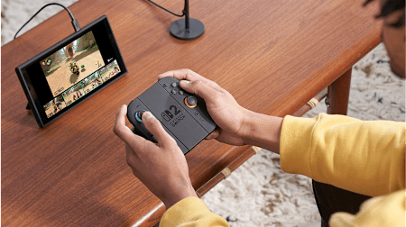 Mus sensorn på sidan av varje Joy-Con 2 controller låter dig förvandla ytor som ett bord eller ditt knä till en musplatta.