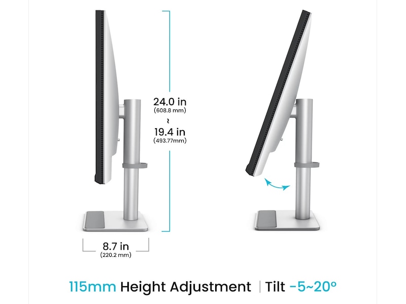 Med stativ (stående orientering) - bredd: 42.44 cm - djup: 22.02 cm - höjd: 73.96 cm - vikt: 9.1 kg, Med stativ (liggande orientering, högsta position) - bredd: 71.45 cm - djup: 22.02 cm - höjd: 60.88 cm - vikt: 9.1 kg, Med stativ (liggande orientering, lägsta position) - bredd: 71.45 cm - djup: 22.02 cm - höjd: 49.38 cm - vikt: 9.1 kg, Utan ställ - bredd: 71.45 cm - djup: 8.27 cm - höjd: 42.44 cm - vikt: 6.05 kg
