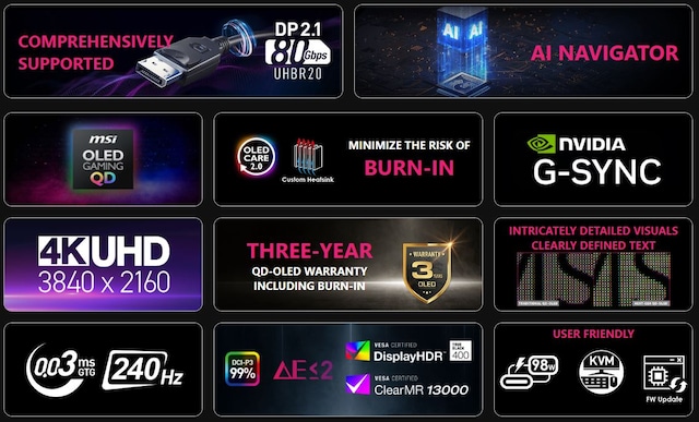 Anpassat kylelement, 3:e generationens QD-OLED teknik, Konsolläge, KVM, VESA Certified ClearMR 13000, Adaptive-Sync-teknologi, Bild för bild, Auto low latency mode (ALLM), Less Blue Light PRO, Ramlös kantdesign, Bild i bild, OLED Care 2.0, Varierbar uppdateringsfrekvens (VRR), Grafenfilm, Delta E≤2 färgprecision, 5-vägs styrpinne