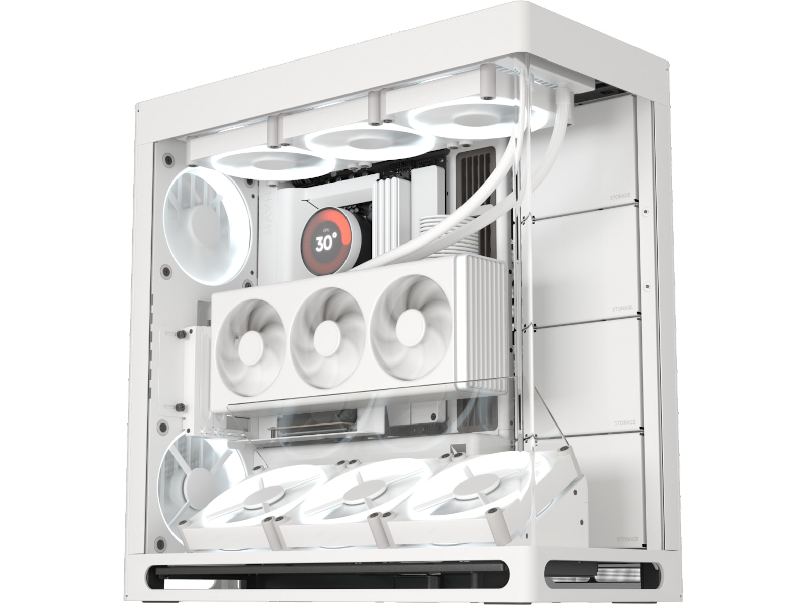 HAVN Hybrid Structure placerar GPU:n fram och tillbaka, helt framställd bakom Unisheet-glaset med panoramautsikt. Den här designen framhäver inte bara dina nyckelkomponenter utan förbättrar också GPU-luftflödet för optimal prestanda.