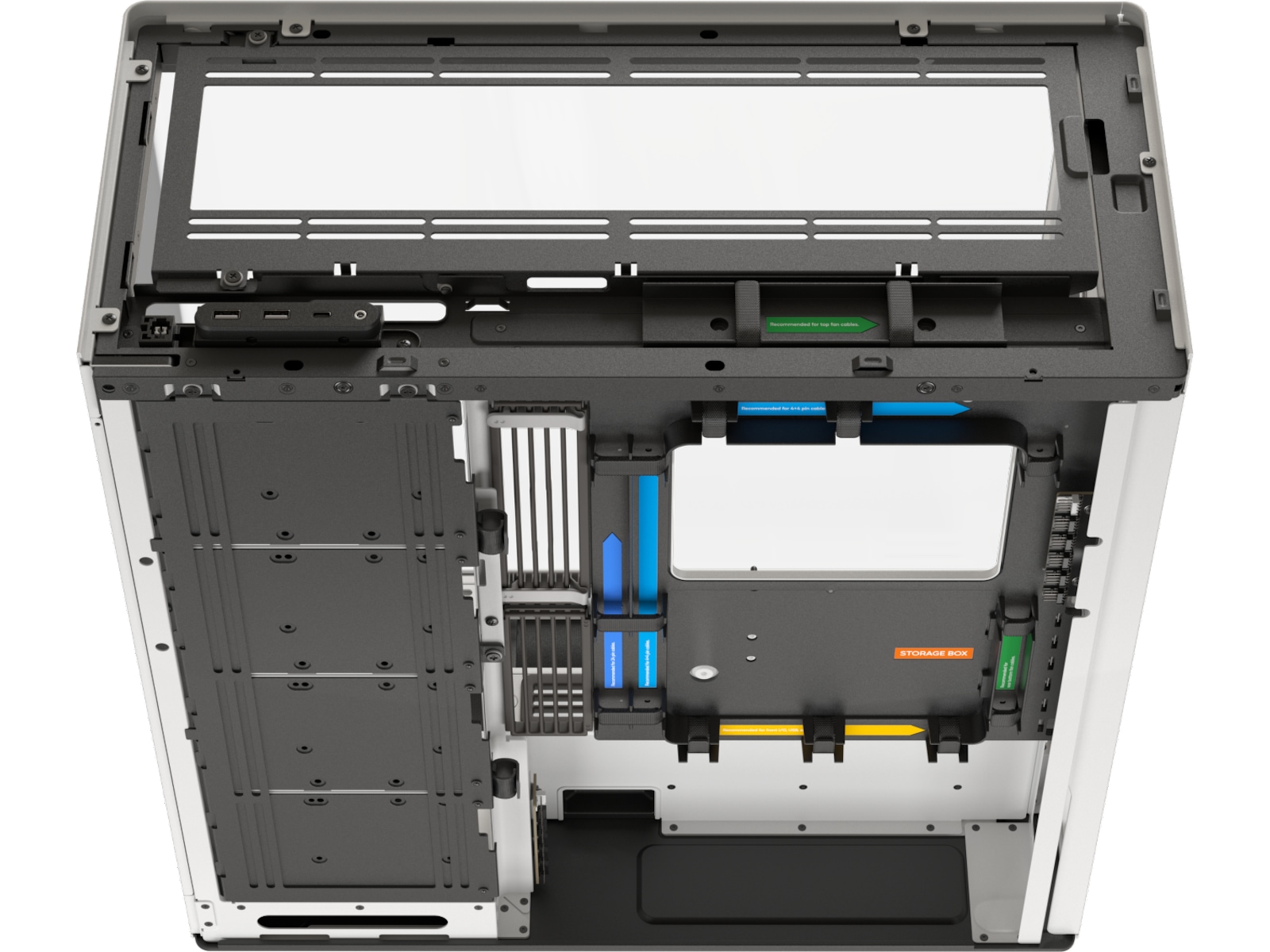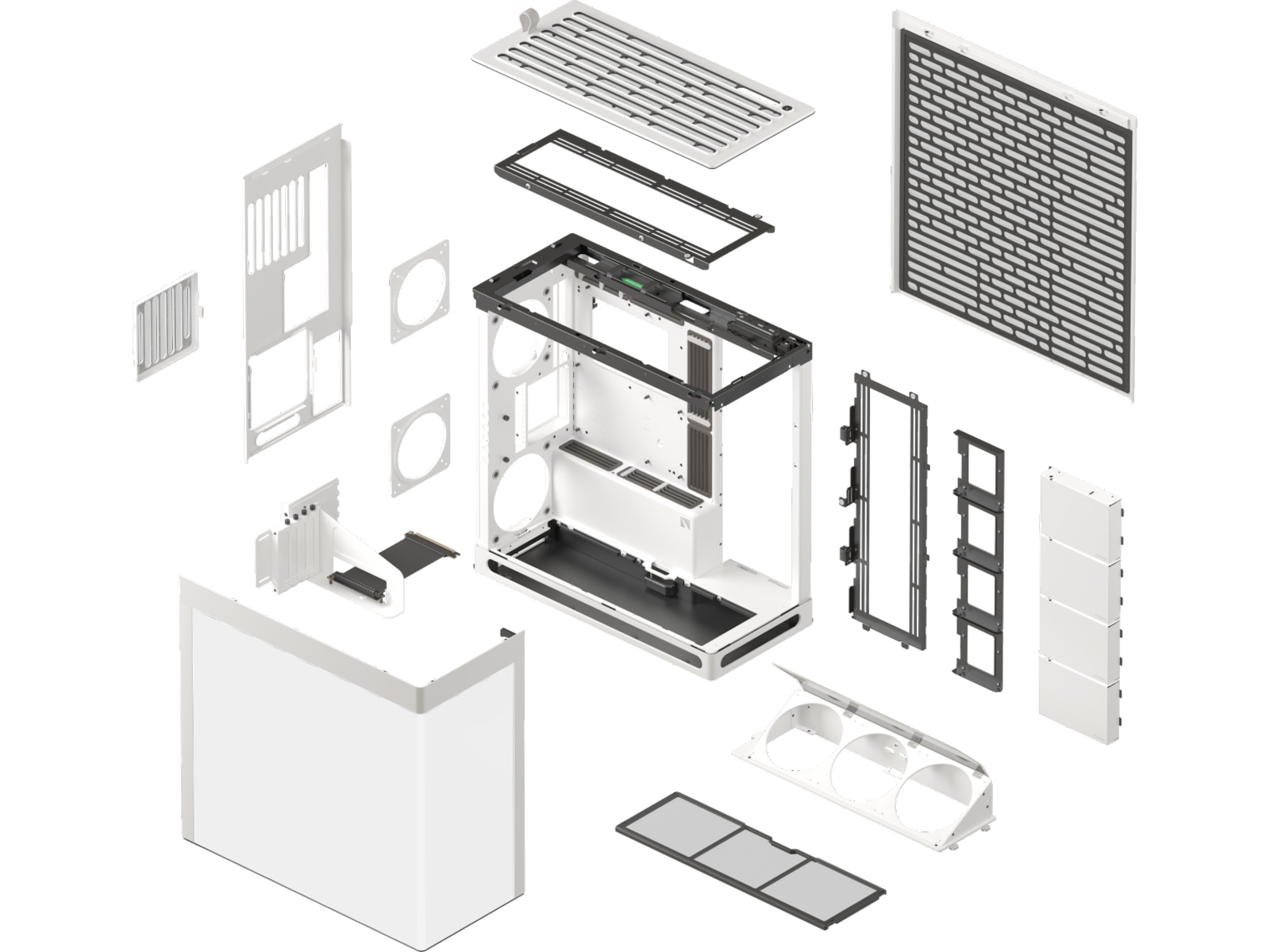 - Förbättrad termisk prestanda med anpassad ventilation, som stöder upp till 11 x 140 mm fläktar och 420 mm radiatorer på ovansidan och sidan.