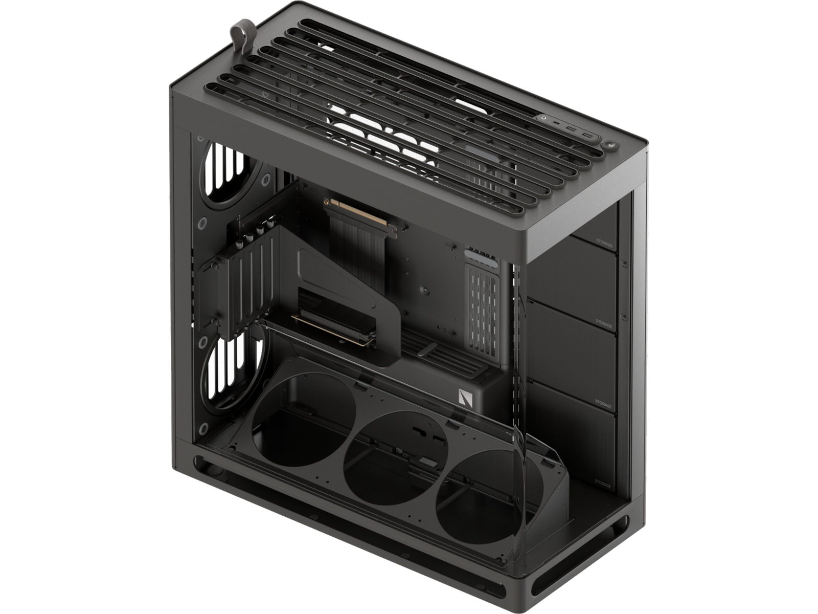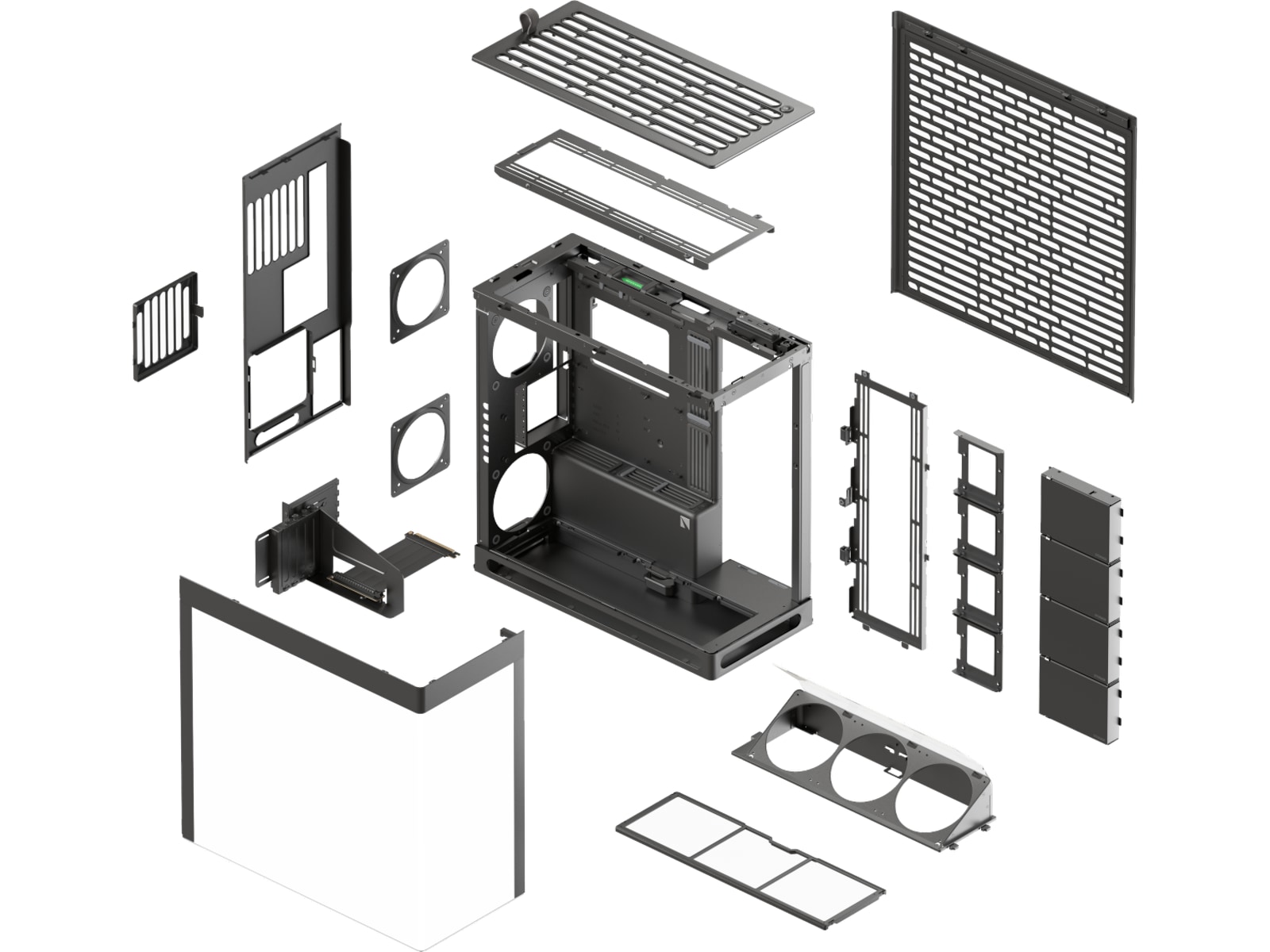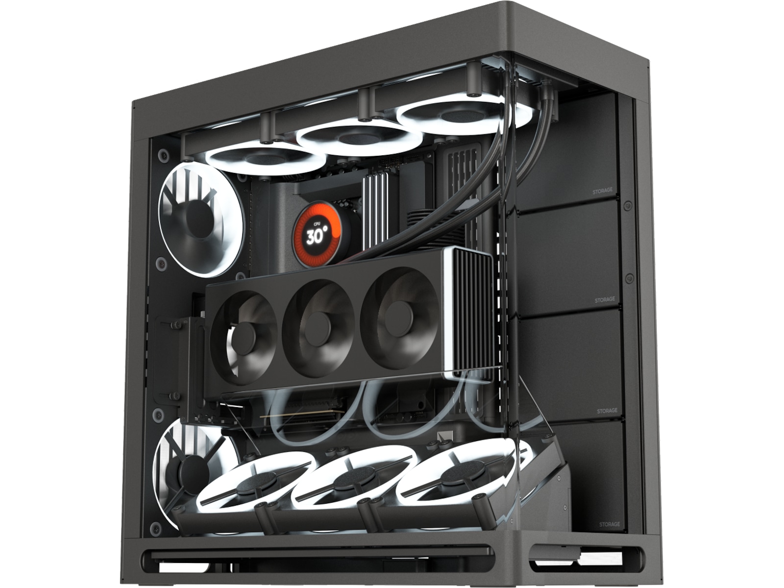 - Förbättrad termisk prestanda med anpassad ventilation, som stöder upp till 11 x 140 mm fläktar och 420 mm radiatorer på ovansidan och sidan.