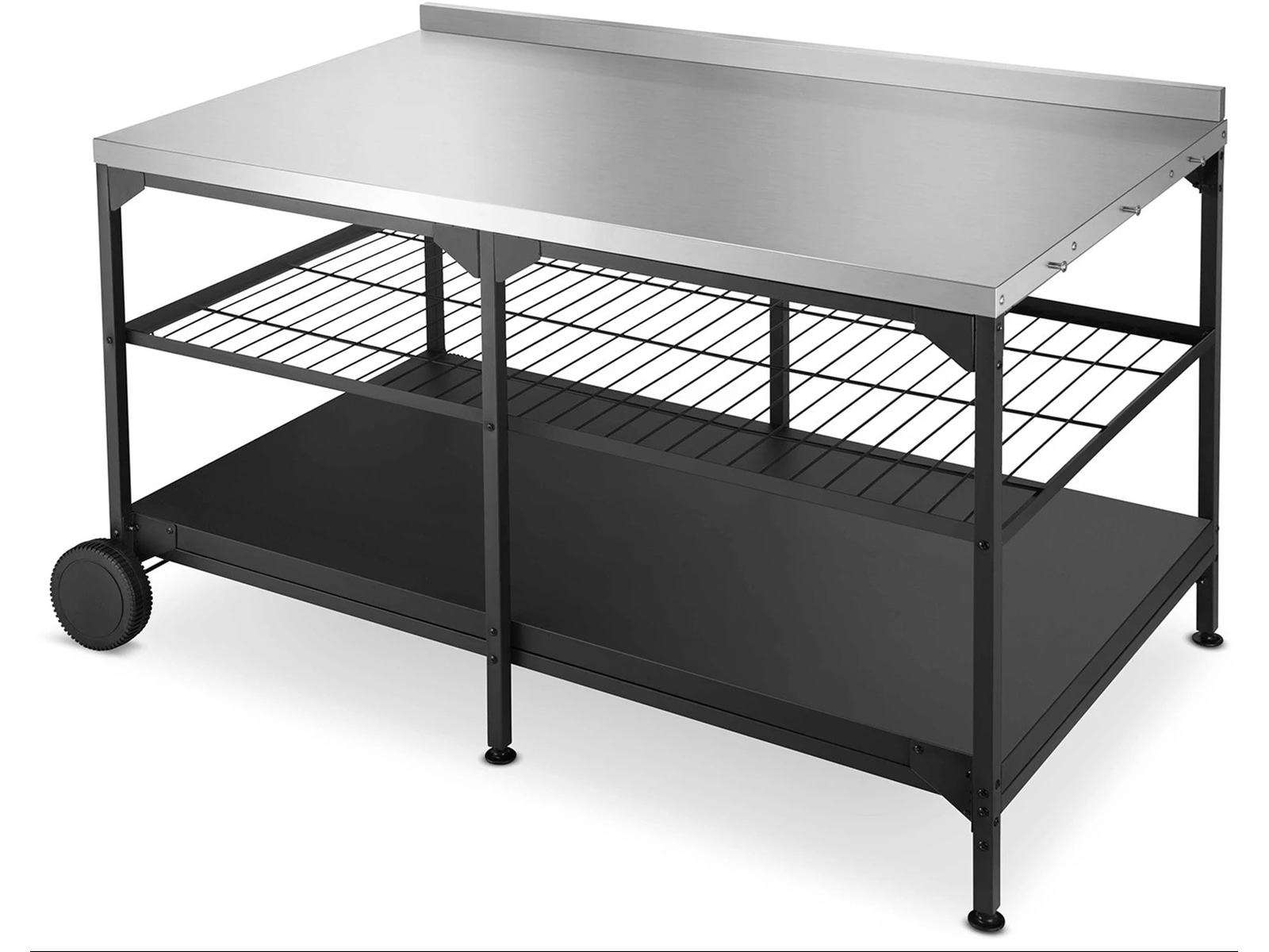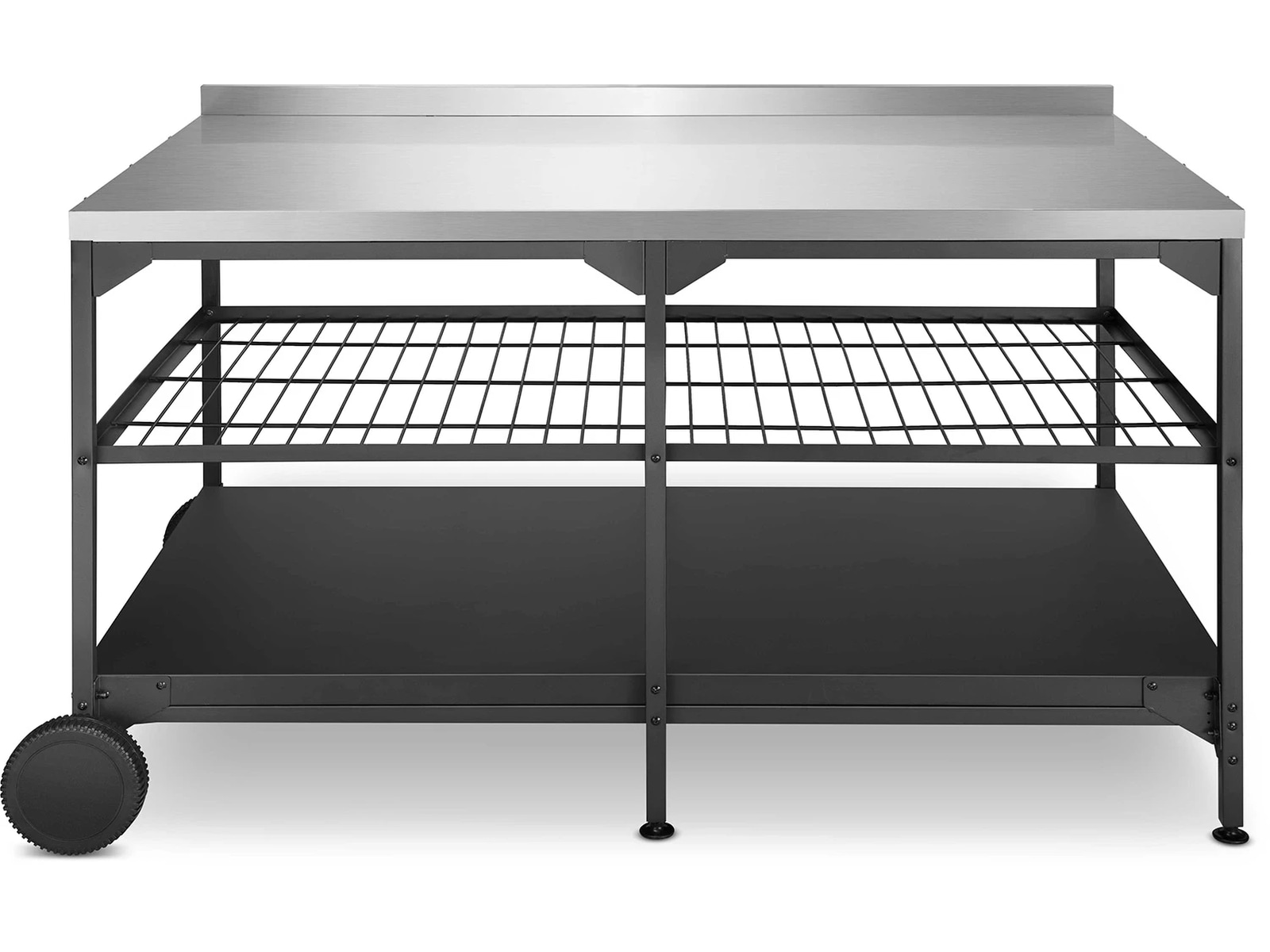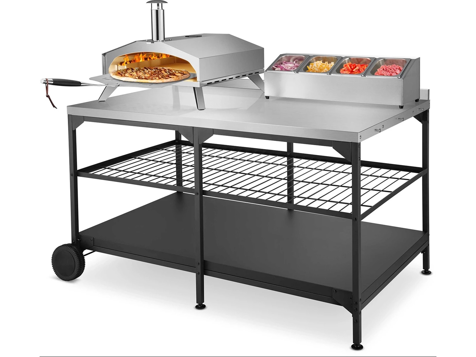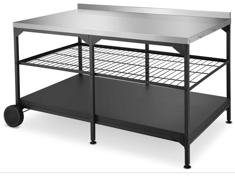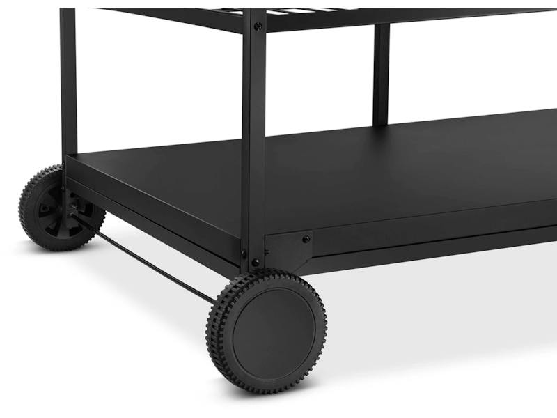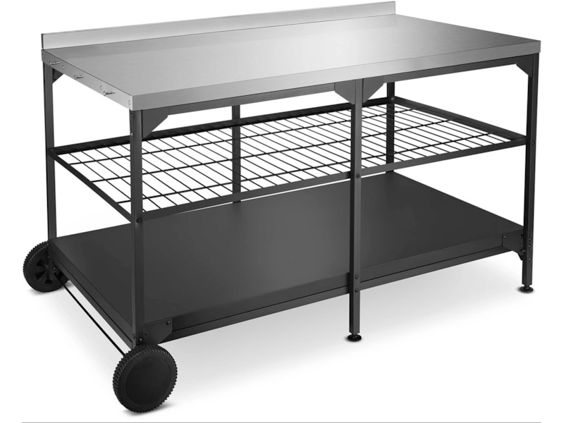 Austin och Barbeque Bord med förvaring är ett bord där du både kan placera pizzaugnen och tillaga pizzorna. Här kan du tillaga och grädda pizzorna i arbetshöjd, samtidigt som bordet är utrustat med praktiska förvaringshyllor. Bordet är tillverkat av rostfritt stål, som är ett slitstarkt och underhållsvänligt material. Längs sidorna av bordet finns krokar där du med fördel kan förvara exempelvis pizzaspaden. Bordet är utrustat med hjul för enkel flyttning.