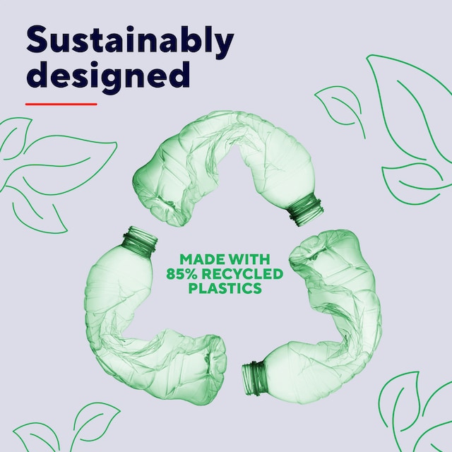 Tillverkad av 85 % återvunnen plast för miljömedvetna användare.