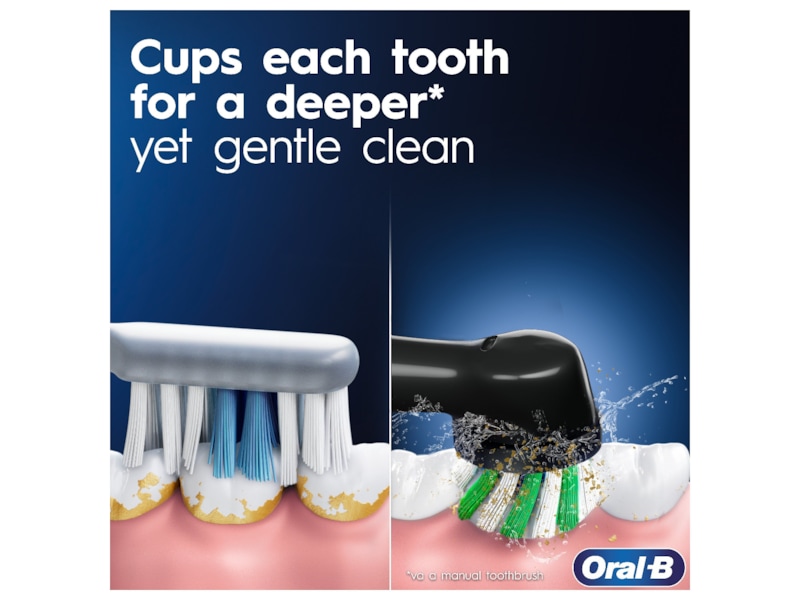 - Oral-Bs unika 2D-rengöringsteknologi: rör sig fram och tillbaka och roterar för upp till 100 % mer plackborttagning jämfört med en manuell tandborste