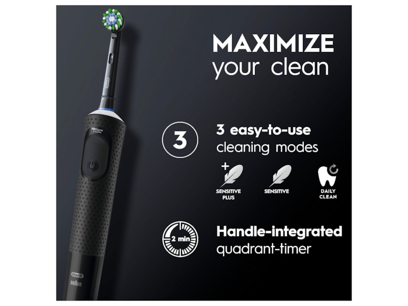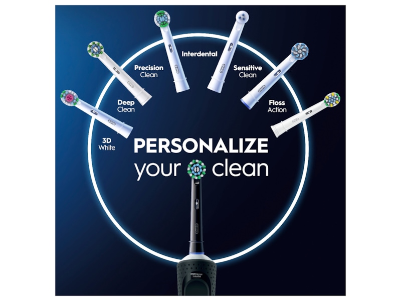 Vitality Pro använder en kombination av oscillerande och roterande rörelser för att ta bort upp till 100 % mer plack jämfört med en manuell tandborste och säkerställer en grundlig rengöring av tänderna.