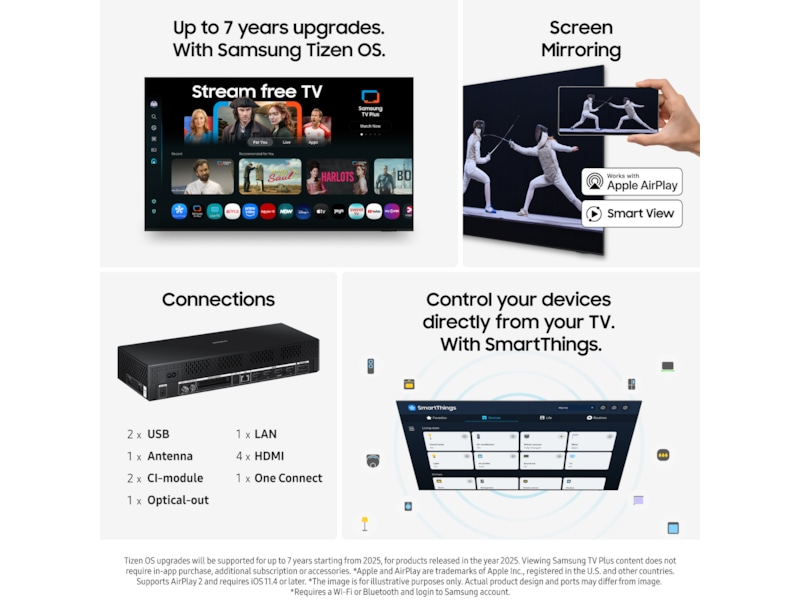 Apple AirPlay-support, Samsung Health, Embeded POP, Gaming Hub, Live Översättning, One Connect Box, Klicka för att söka, Samsung Vision AI, Wireless TV On, Stöd för SlimFit Cam, Light-Sync, Varje dag+, Smart kalibrering, Super Ultra Wide Game View, Minikartszoom, Karaoke-mikrofon, Generativ tapet, Rörelsedetektion