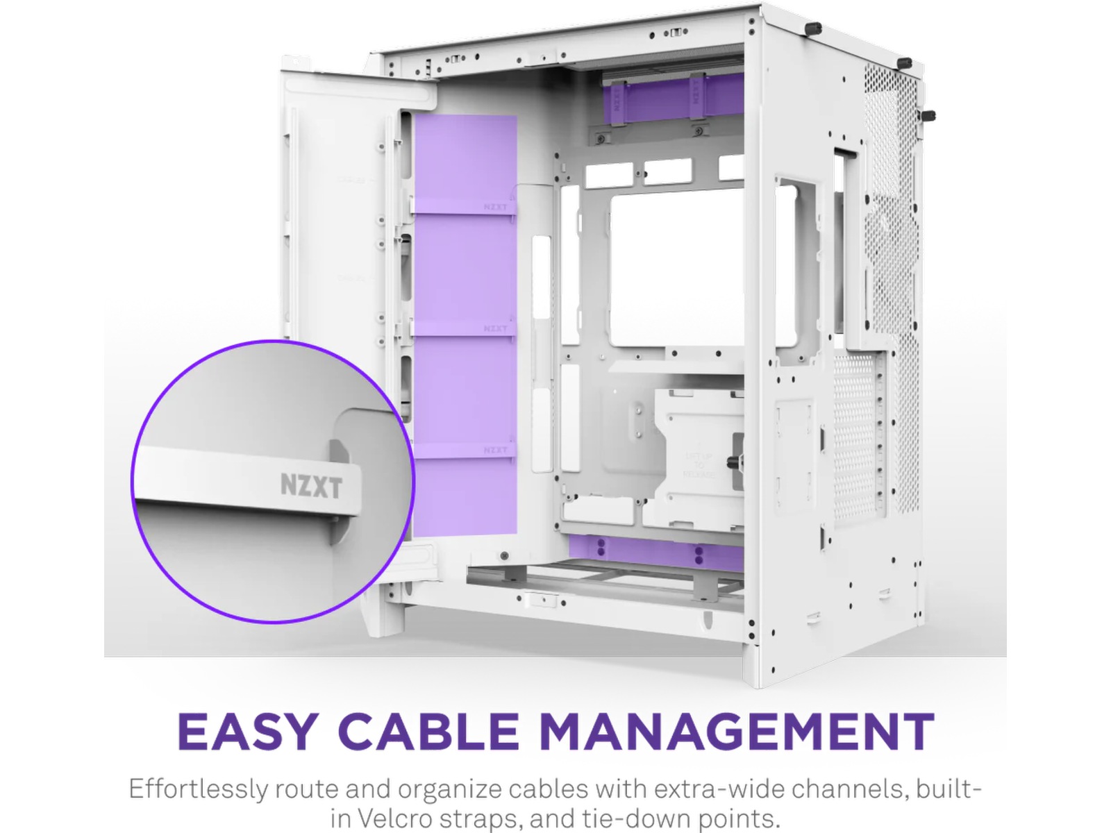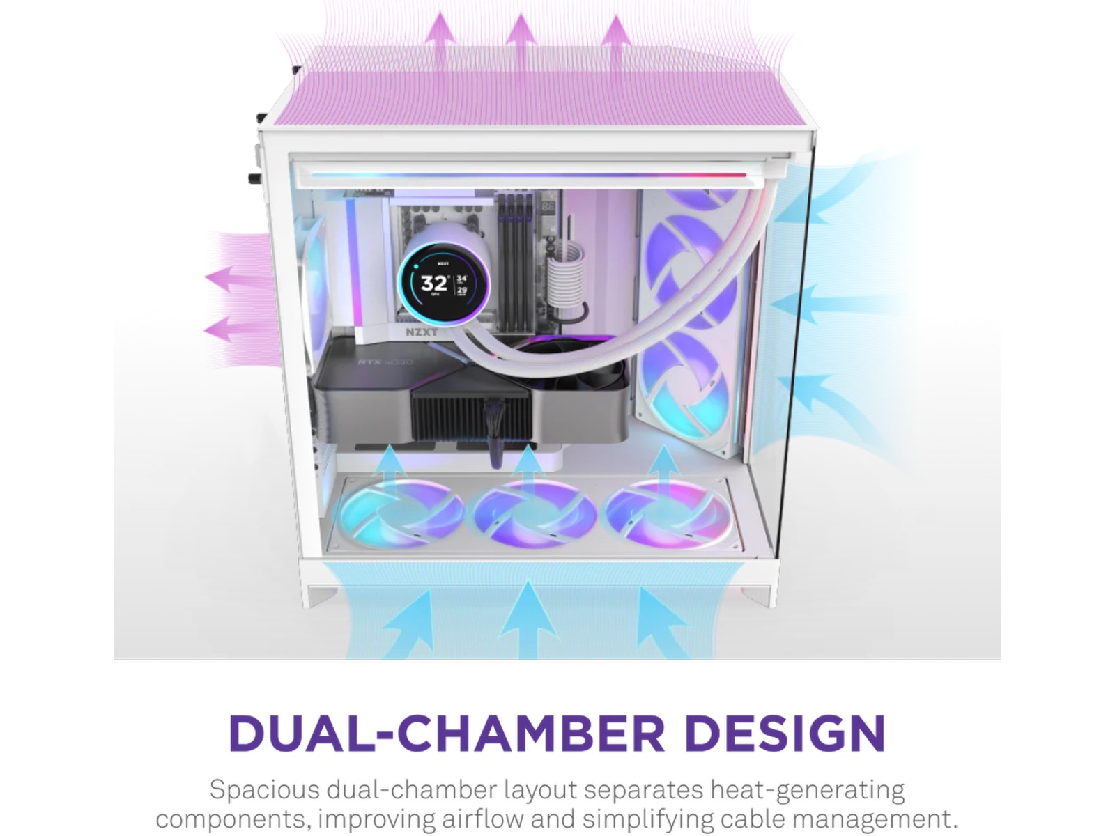 H9 Flow är ett rymligt mid-tower ATX-chassi byggt för högpresterande byggnationer som balanserar luftflöde och estetik. Dess tvåkammarsdesign förbättrar kylning och kabelhantering, medan perforerade paneler, vinklade fläktar och gott om stöd för fläktar och radiatorer ger optimal termisk prestanda.
