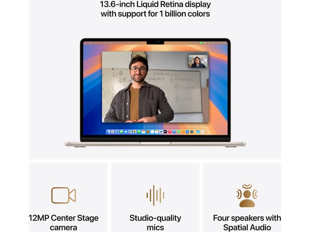 • KRISTALLKLAR SKÄRM – Liquid Retina-skärmen på 13,6 tum har stöd för en miljard färger.(2) Bilder och videor sticker ut med hög kontrast och tydliga detaljer, och text blir superskarp.