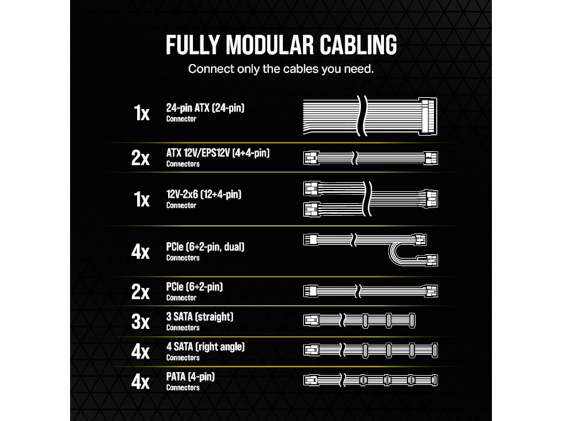 Håll kabelkaoset nere genom att koppla endast de kablar ditt system behöver och inget annat. Fem universella 8-pin-kontakter kan användas med valfri 8-pin-kabel, som tillgodoser alla strömbehov hos moderna moderkort och GPU:er.