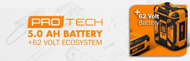 Protech +62 Volt batteriverktyg är en serie produkter som använder samma batteripaket. Protech +62 Volt är ett modernt och miljövänligt batterisystem. Batteriet har en stark spänning som gör det möjligt för verktygen att hantera även de tyngsta uppgifterna i trädgården.