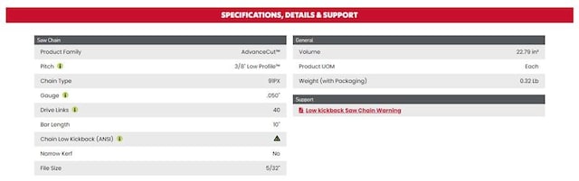 Kedjan är en Oregon 40 cm (16”) kedja som sitter på ett självsmörjande sågblad. Kedjans hastighet är 20 m/s.