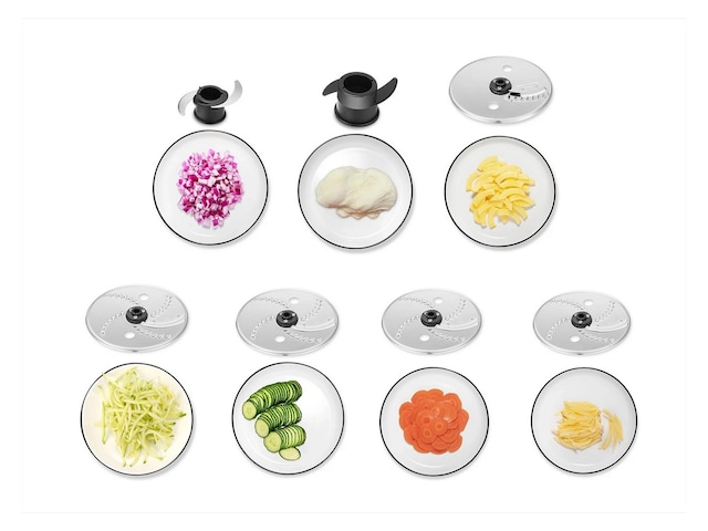 Innehåll i lådan Matberedare, Skivblad, Emulgeringsskiva, Citruspress, Plastmixerkanna, Knådblad, Hackblad, Bruksanvisning