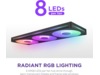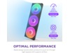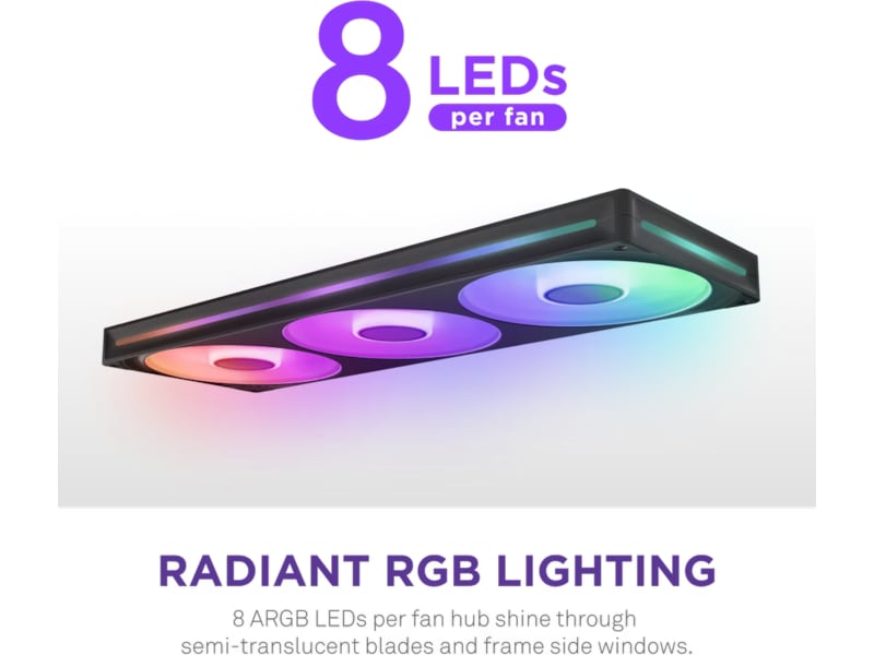 - Åtta individuellt adresserbara RGB-lysdioder per fläktnav sprids genom halvgenomskinliga blad för briljant färgglada bilder.