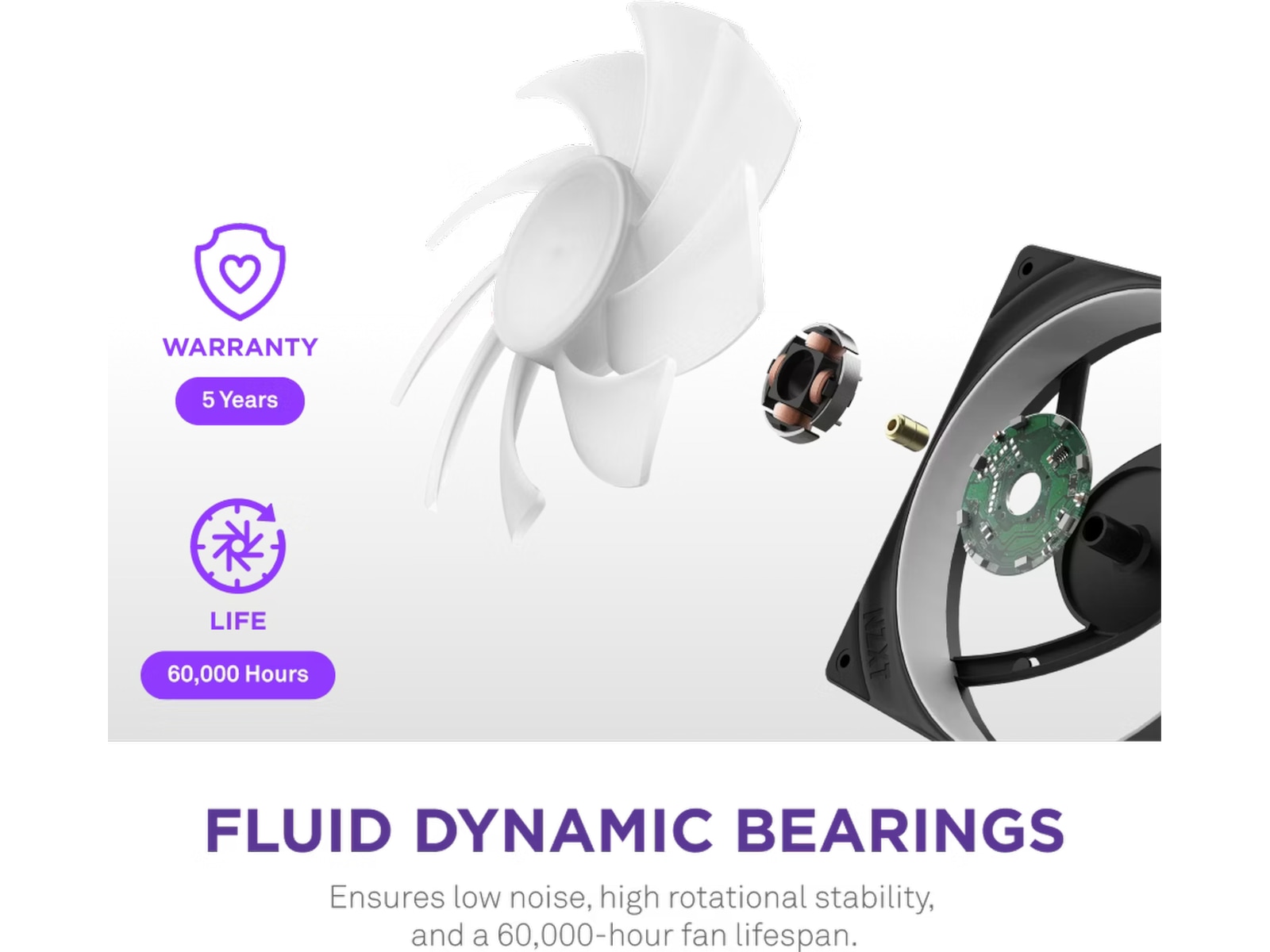 Säkerställer lågt ljud, hög rotationsstabilitet och en fläktlivslängd på 60 000 timmar.