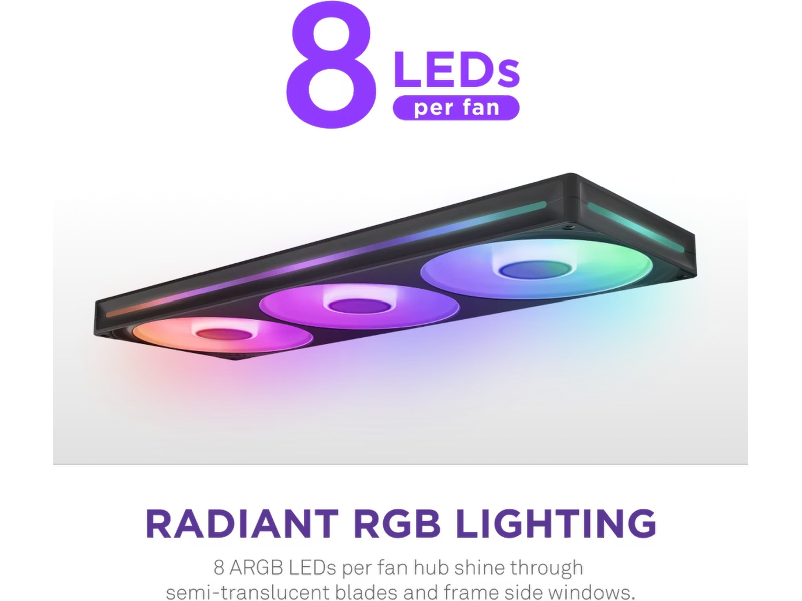 8 aRGB-lysdioder per fläktnav lyser genom halvgenomskinliga blad och ramsidorutor.
