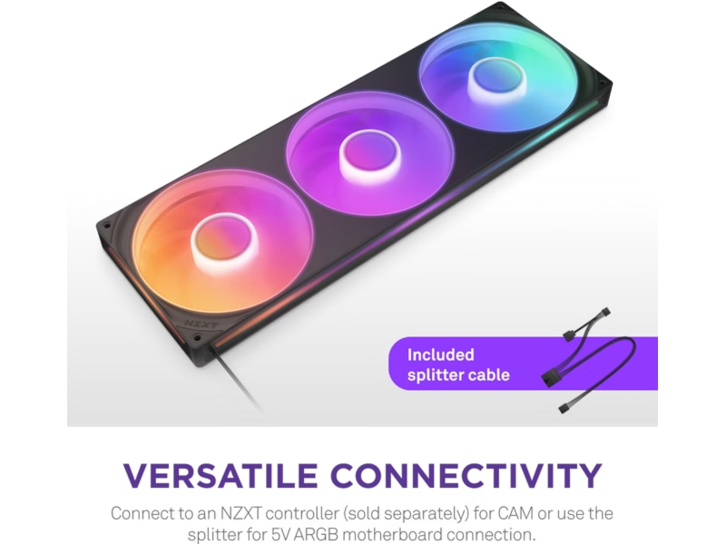 - Anslut helt enkelt en enda kabel till en NZXT-kontroller (säljs separat) för belysning och hastighetskontroll via NZXT CAM-programvara. Eller anslut till valfritt moderkorts 5V ARGB-huvud med den medföljande splitterkabeln.
