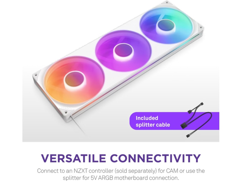 - Anslut helt enkelt en enda kabel till en NZXT-kontroller (säljs separat) för belysning och hastighetskontroll via NZXT CAM-programvara. Eller anslut till valfritt moderkorts 5V ARGB-huvud med den medföljande splitterkabeln.