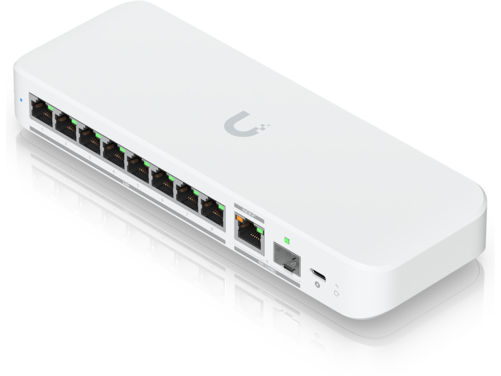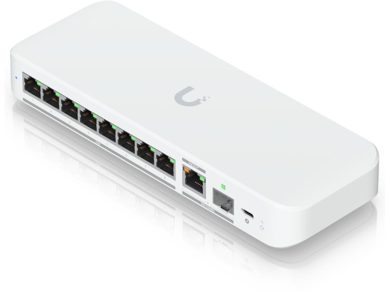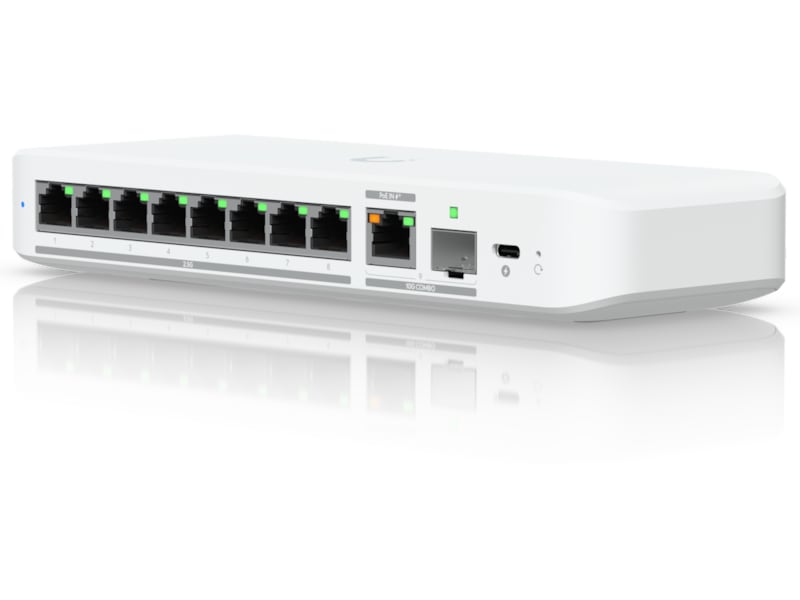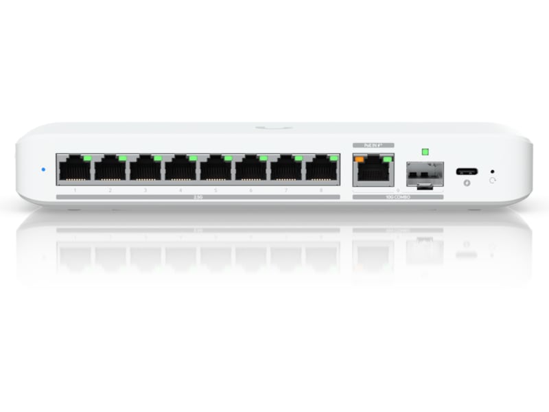 Ubiquiti UniFi Flex 2.5G Switch Flexible, 8-port 2.5 GbE switch with a 10 GbE RJ45/SFP+ combination uplink port that can be powered with a USB-C or PoE+ adapter.