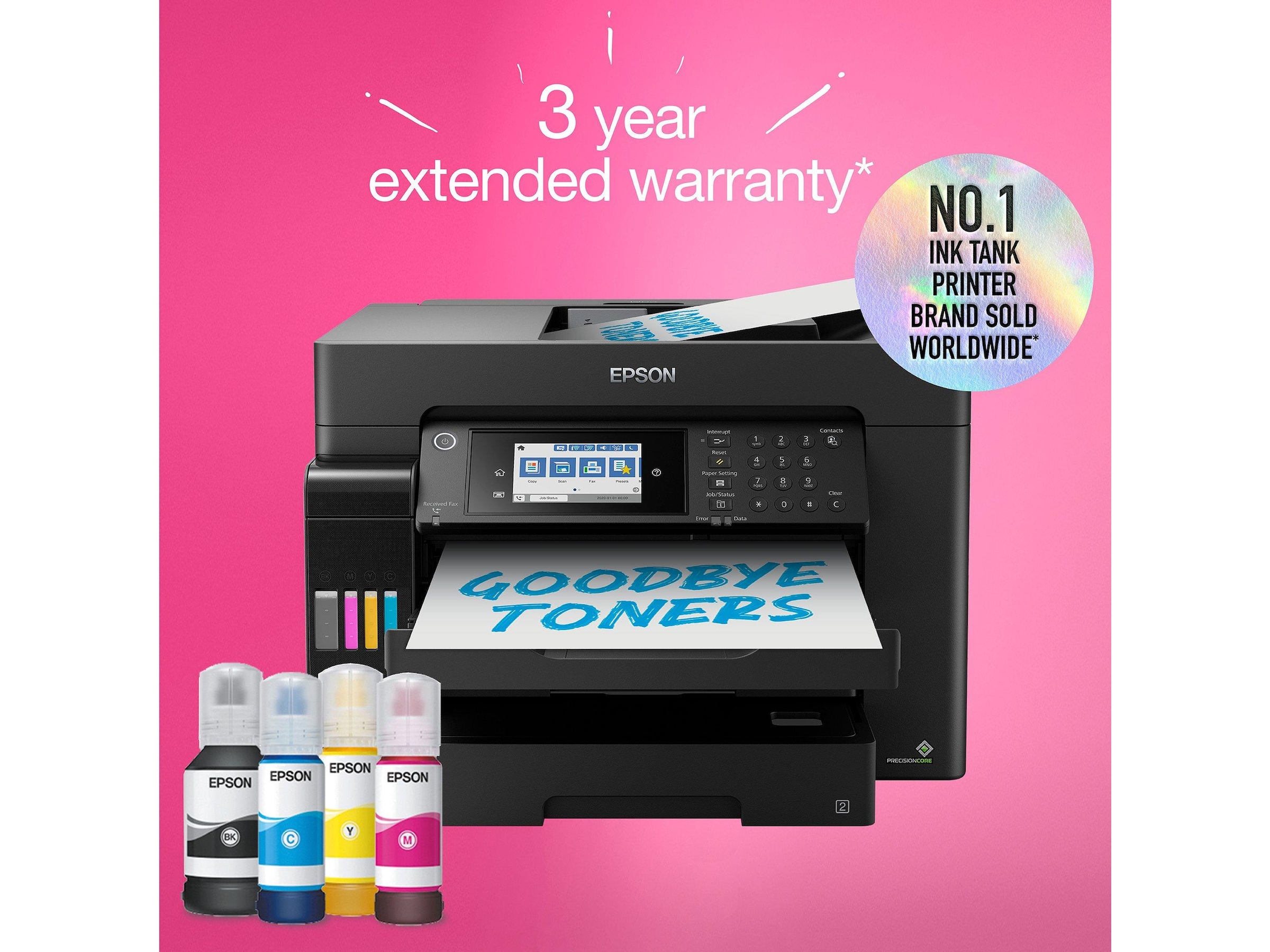 Denna högpresterande EcoTank A3+-multifunktionsskrivare med fax passar perfekt för företag och har påfyllningsbara bläckbehållare som levererar kontorsutskrifter till extra låg kostnad. Skrivaren har ett främre pappersfack med kapacitet för 500 ark, ett bakre fack för 50 ark och en automatisk dokumentmatare för 50 ark. Skriv ut hur du vill med mobil utskrift, Ethernet och en 10,9 cm stor LCD-pekdisplay med hårda knappar.