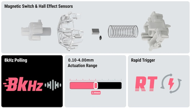 En genomsnittlig människas reaktionstid är 300-500 ms, medan en professionell spelare kan nå 200 ms genom träning. Den totala tiden det tar för ett knapptryck att registreras efter fingerkontakt kan dock lätt överstiga >100 ms, mycket av den tiden spenderas på att knappen sjunker till nedslagsläget. En magnetisk brytare halverar denna tid genom att separera processen för aktivering, vilket uppnås med ljusets hastighet genom Hall-effekten, från den taktila feedbacken, som kan ta så lång tid du vill för att försäkra ditt finger om dess förekomst. Och om du är lockad av extrem prestanda, då är det beryktade snabba triggerläget definitivt för dig.