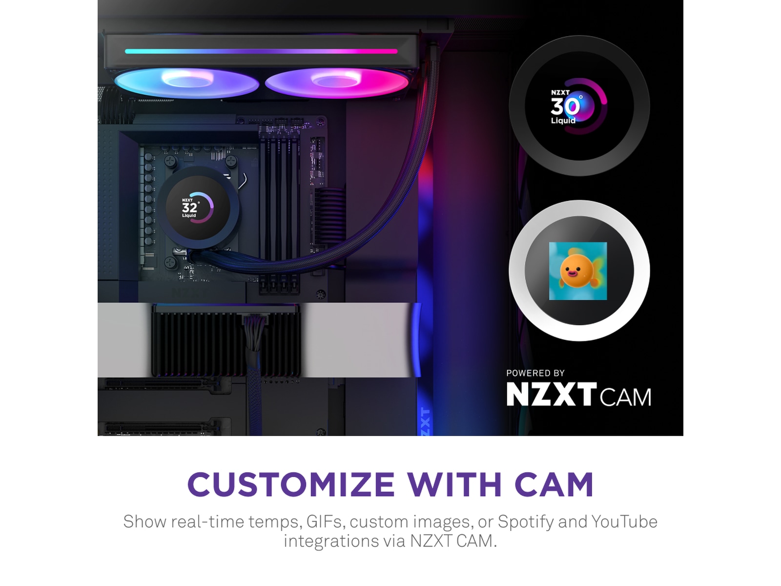 • NZXT CAM programvara: Använd NZXT CAM för att övervaka temperaturer, anpassa LCD-displayen och kontrollera fläkt- och pumpshastigheter — allt genom ett intuitivt, användarvänligt gränssnitt.