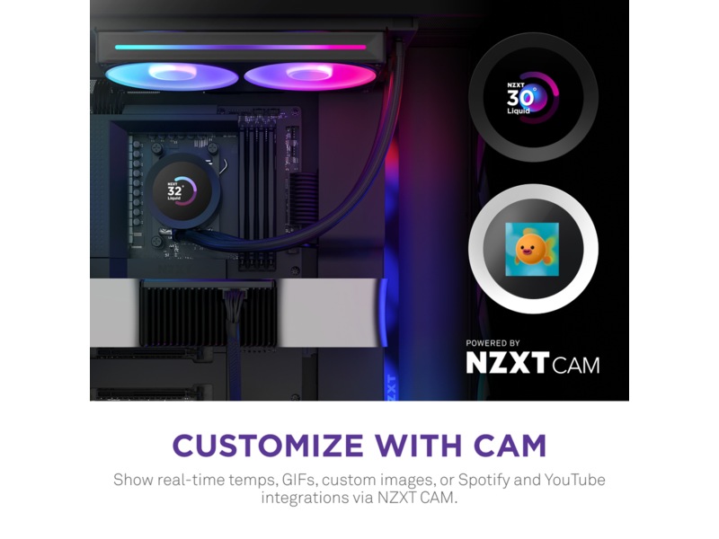 Visa realtidstemperaturer, anpassade bilder, GIFs, och webbintegrationer som Spotify och YouTube — allt på en livfull 1,54-tum fyrkantig LCD, fullständigt styrd via NZXT CAM.