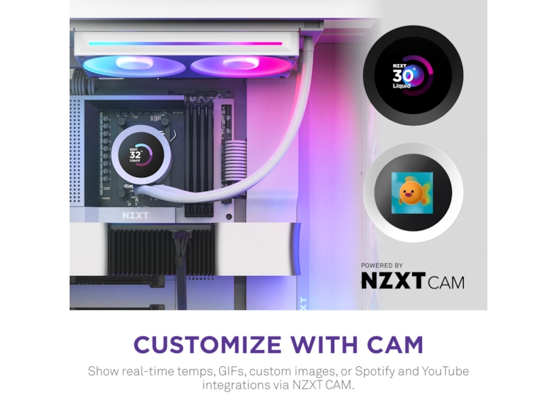 Visa realtidstemperaturer, anpassade bilder, GIFs, och webbintegrationer som Spotify och YouTube — allt på en livfull 1,54-tum fyrkantig LCD, fullständigt styrd via NZXT CAM.
