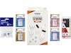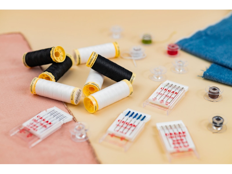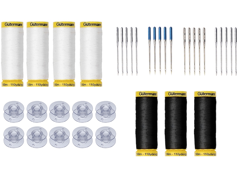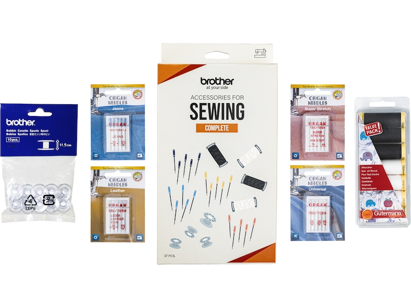 5 x Organ universella nålar, 5 x Organ jeansnålar, 5 x Organ super stretch nålar, 5 x Organ lädernålar, 1 x Gütermann trådkit (7 rullar) och 10 x spolar från Brother.