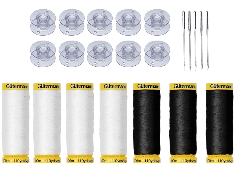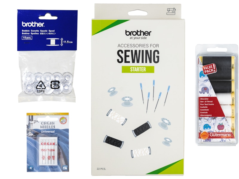 5 x Organ universalnål, 1 x Gütermann trådkit (7 rullar) och 10 x spolar från Brother.