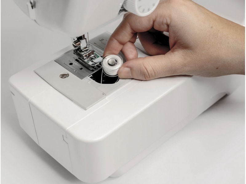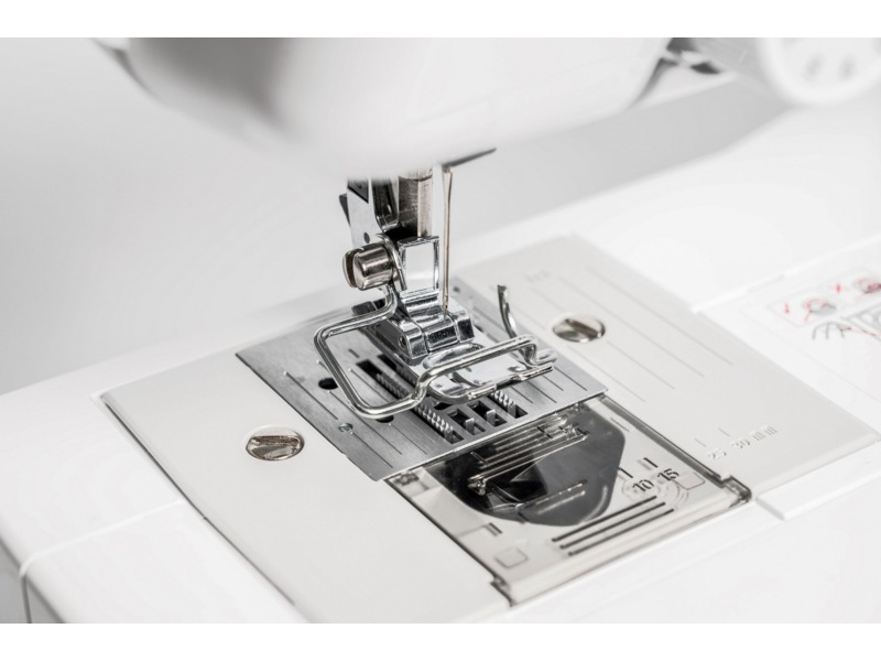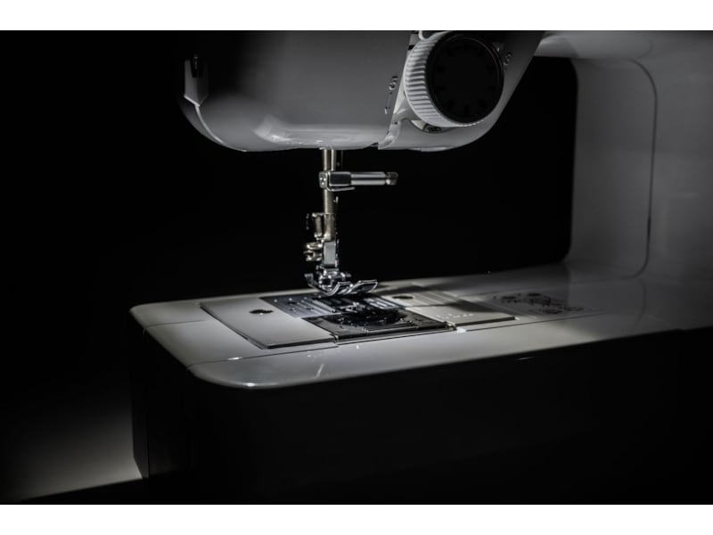 Maskinen är lätt att träda med drop-in spolsystemet och har bekvämt friarm för att sy i byxben och ärmar samt LED-belysning.