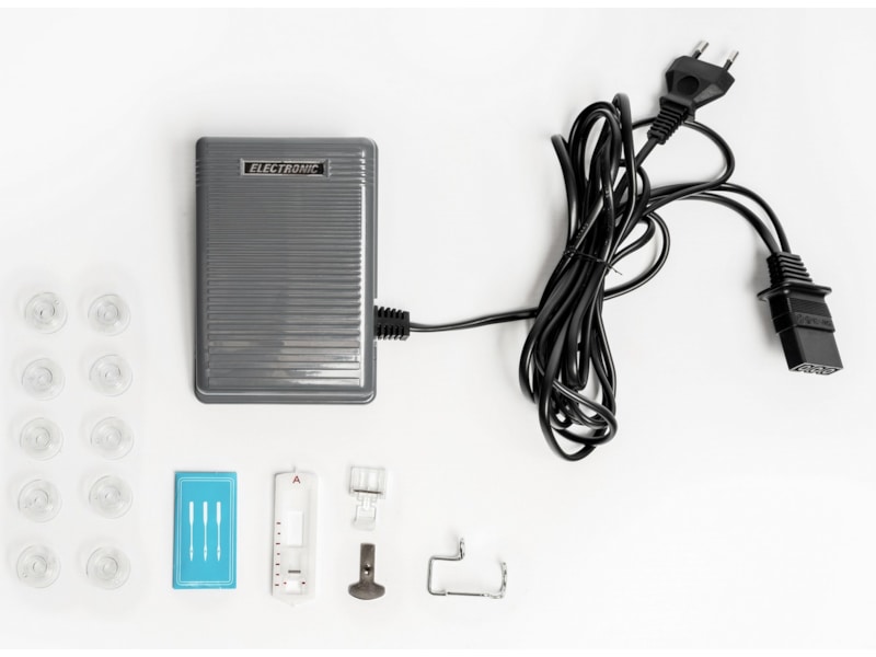 - Tryckfötter: Zigzagfot (sitter på maskinen från start), knapphålsfot och blixtlåsfot