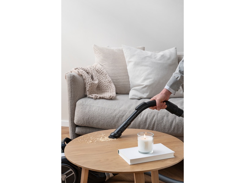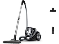 Ingen påse behövs, 2,5 liters behållare, 75 dB, 9 m räckvidd, kompakt design.