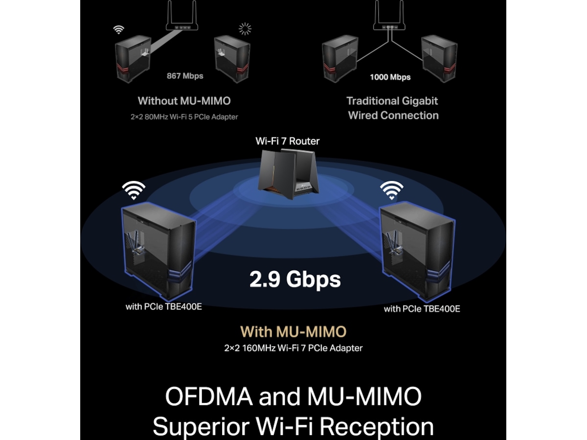 Archer TBE400E tar din PCs Wi-Fi-mottagning till nästa nivå med den revolutionerande kombinationen av OFDMA och MU-MIMO. Detta säkerställer effektiviteten av din PCs Wi-Fi-anslutning genom att tillåta fler enheter att kommunicera med din router samtidigt, istället för att vänta på tur för data.