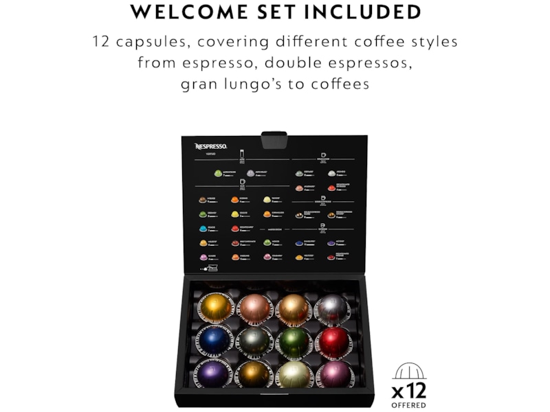 - En Nespresso kaffemaskin för 7 koppstorlekar: en perfekt kopp Ristretto (25 ml), Espresso (40 ml), Double Espresso (80 ml), Gran Lungo (150 ml), Mug (230 ml), XL Coffee (355 ml) och en kaffe i kanna (535 ml).