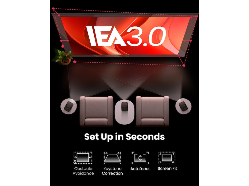 Ställ in på några sekunder: Vår Intelligent Environment Adaptation Technology utför skärmanpassning, automatisk keystone-korrigering, autofokus, och hinderundvikande på bara 3 sekunder.