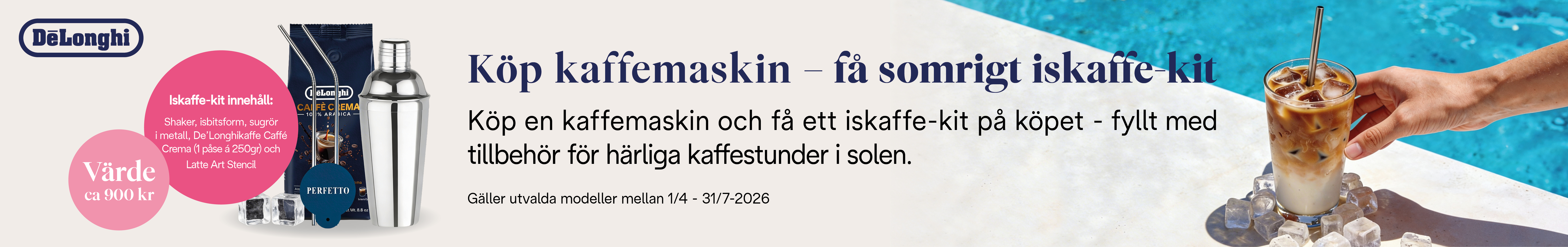 Köp en kaffemaskin och få ett iskaffe-kit på köpet – fyllt med tillbehör för härliga kaffestunder i solen. Värde ca 900 kr