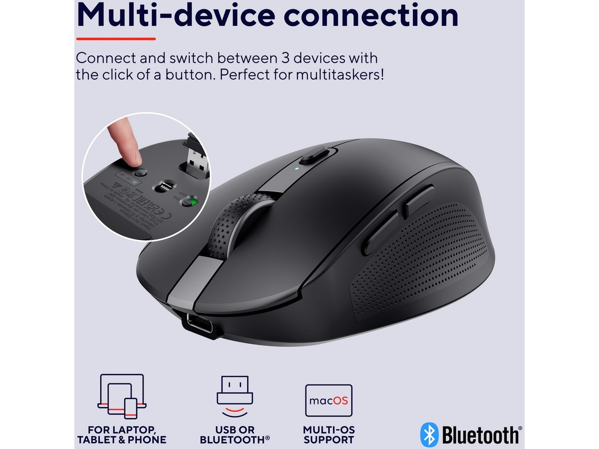 Egenskaper Batteriindikering, Programmerbara knappar, Handhållen, Scrollhjul, På-/avströmbrytare, Horisontal rullning, DPI-nivåindikator, Klotång