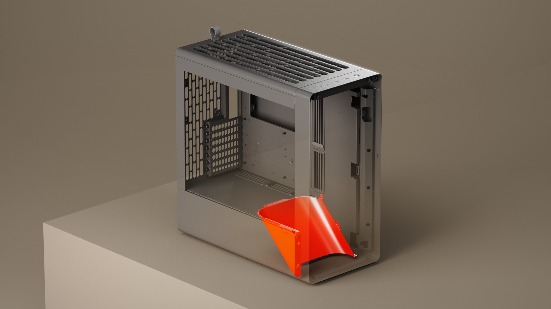 ATX miditower-chassi med hög luftgenomströmning, utrustat med en GPU-fokuserad luftstyrningsramp och dubbla 180 mm-fläktar för effektiv kylning.