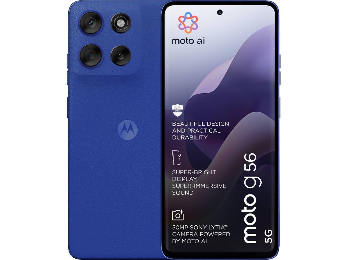 Presentera moto g56 5G, som kombinerar vacker design med praktisk hållbarhet. Njut av den mjuka känslan av en lättgreppad, premiumfinish—plus bekymmersfritt skydd mot vatten, extrem temperaturbeständighet och en reptålig skärm. Förbättra din underhållning på en superljus 6,72” FHD+ skärm förstärkt av kraftfulla stereohögtalare med Bass Boost. Ta fantastiska foton i alla ljusförhållanden med en 50MP Sony LYTIA™ kamera driven av moto ai. Få timmar av kraft på bara några minuter med blixtsnabb TurboPower™ laddning. Släpp loss kraften av en oktakärnig processor vid 5G-hastigheter. Dessutom får du gott om lagring för foton, filmer, låtar och appar. Den nya moto g56 5G. Hållbarhet är vackert.