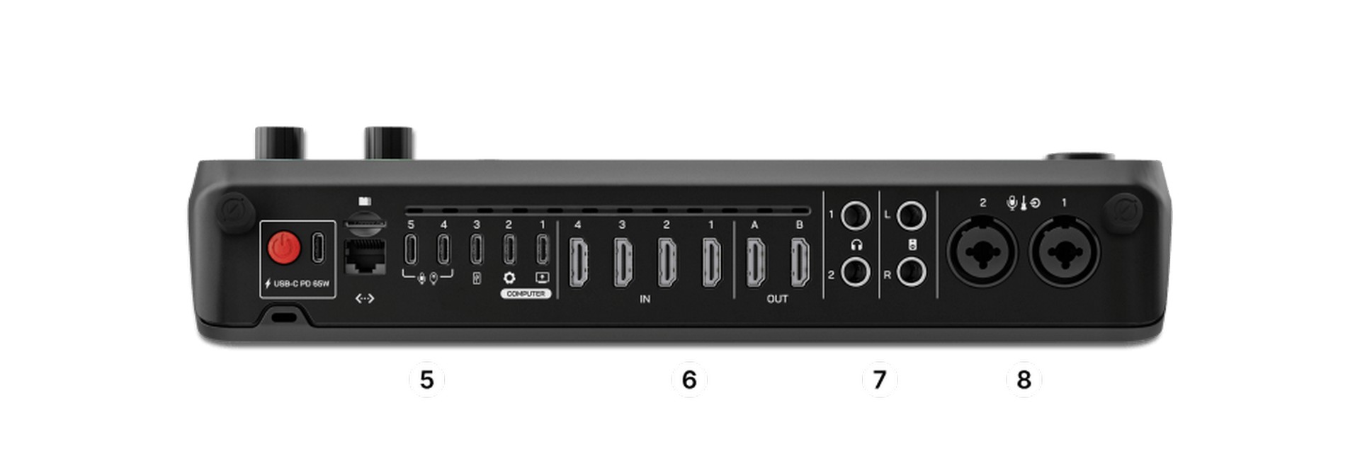 5) USB-video och ljud Anslut upp till två kompatibla webbkameror eller RØDE USB-mikrofoner via USB 4 och 5 för utökad video- och ljudintegration.