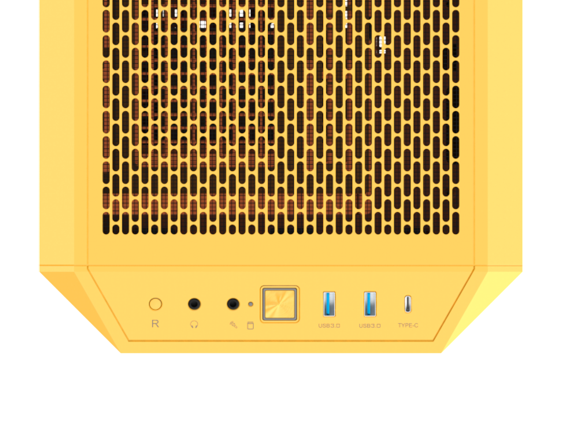 Toppanelen har lättåtkomliga I/O-portar inklusive två USB 3.0-portar, en USB 3.2 Gen 2 Type-C-port, återställningsknapp och HD-ljudportar för omedelbar åtkomst.