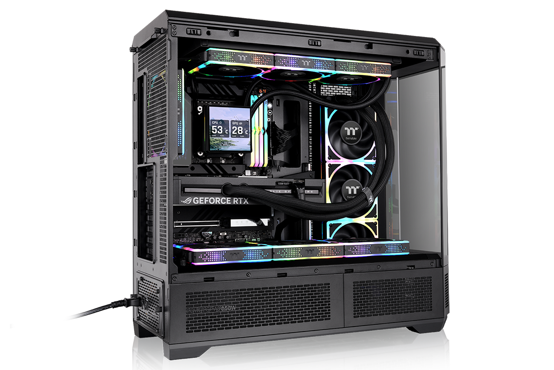 View 600 TG Full Tower Chassi är ett E-ATX-chassi med fyra paneler av härdat glas, roterbara PCI-E-platser, integrerat GPU-stöd och omfattande kylstöd för upp till tio 120/140 mm-fläktar samt 360 mm/420 mm-radiatorer. Ett valfritt 6" LCD Panel Kit finns tillgängligt för förbättrad systemövervakning och visuell anpassning.